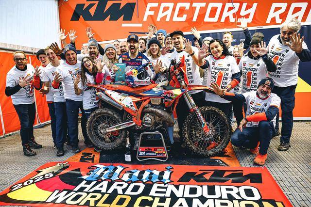 德國站的比賽結(jié)束后,萊騰比切勒已經(jīng)拿到了足夠多的積分差距(166 分,積分榜第二名的博爾特只有 123 分),提前一站奪得了 FIM 極限耐力越野世界錦標賽 2025 賽季的世界冠軍(車手積分年度總冠軍) —— 這是他在該項比賽里的第五個世界冠軍頭銜。