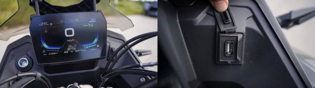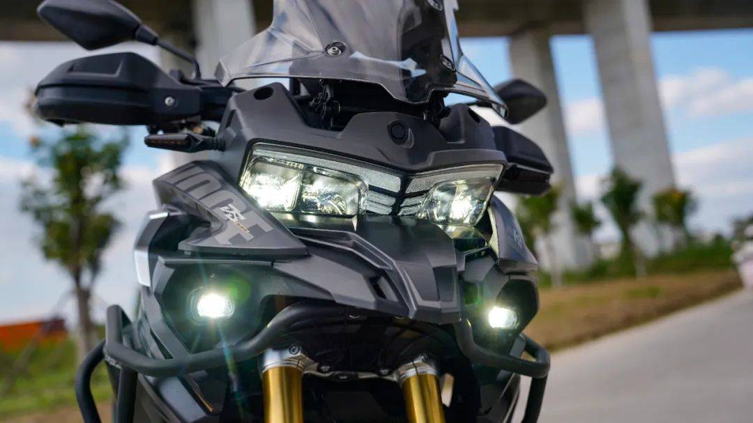 外觀設(shè)計方面,無極DS625X與自家DS525X保持相同風(fēng)格,但又與之不同,相同的是大燈組的設(shè)計棱角分明且凹凸造型,造型、質(zhì)感都是這個級別的一流水準(zhǔn),顏值沒得說,同時大燈組下方加入了一組霧燈的設(shè)計,在保證了照明角度的有同時,也免去了后期改裝的麻煩,且油箱兩側(cè)護板更顯寬大,帶來的效果很明顯,風(fēng)阻保護為出色,更貼合旅行。風(fēng)擋支持兩檔手動可調(diào),但原廠的風(fēng)擋在風(fēng)阻保護上效果一般,即使升到高位狀態(tài)下還是會有較大的氣流襲擾胸口。全LED燈源,前照燈部分的燈帶造型設(shè)計感濃厚,配合LED點亮效果,顏值拿捏,同時大燈下方配備了霧燈,在夜間會很實用。儀表則是搭配了7寸的TFT儀表,轉(zhuǎn)速,時速,檔位,油量,胎壓等信息一應(yīng)俱全,且支持手機互聯(lián)以及投屏導(dǎo)航等功能,值得一提的是無極自家的“咕咕行”更是緊跟潮流的融入AI騎行助理,讓騎行更加智能,便捷。同時標(biāo)配了前置行車記錄儀,以及前護杠,免去改裝。儀表左側(cè)設(shè)置了點煙器接口,最大功率120w,足夠為充氣泵等設(shè)備供電,儀表右側(cè)單獨設(shè)置了USB接口。油箱容積18升,續(xù)航可以達400公里以上。作為追逐自由旅行的ADV車型,座椅加熱,手把加熱目前都屬于標(biāo)配狀態(tài),DS625x將兩個開關(guān)設(shè)置在了遠光開關(guān)上方,支持3檔可調(diào),但個人以為位置還需要優(yōu)化。手把按鍵采用了DS900x上的那套多功能手把,功能豐富且易用,按壓質(zhì)感以及阻尼感出色。動力平臺