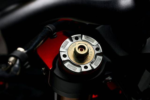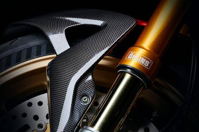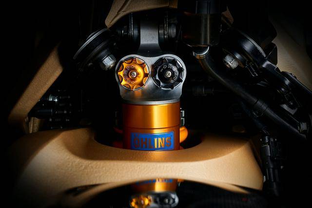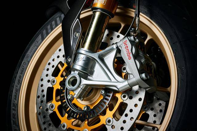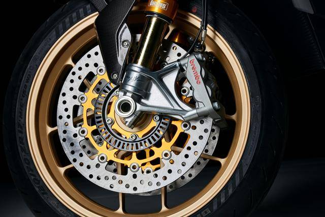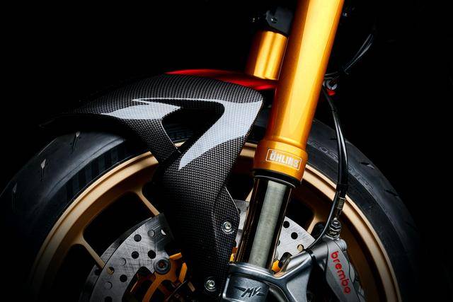 5、標(biāo)配了高規(guī)格的 Ohlins 奧林斯懸掛系統(tǒng),前面是叉芯口徑為 43 mm、行程為 120 mm 的 NIX 30 倒立式前叉,后面是行程為 133 mm 的 TTX GP 36 減震;制動系統(tǒng)采用了 Brembo 布雷博的配套,前面是雙 320 mm 剎車碟 + Hypure 剎車卡鉗,后面是 220 mm 單剎車碟;廠方稱,新車的全身配置,將尖端技術(shù)與情感表現(xiàn)融為了一體;