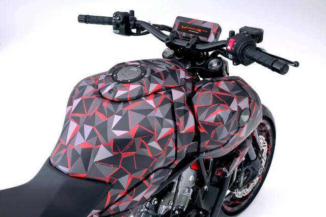 4、車身的油箱兩側(cè)的翼子板采用了左右不對稱的設(shè)計,油箱展示的 “ Honda Wing ” 翅膀標(biāo)志是他們針對旗艦級車型的新設(shè)計(該設(shè)計將從明年開始陸續(xù)應(yīng)用到不同類型的旗艦級車型上)。