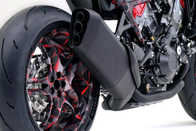 V3R 900 概念車上所搭載的是去年 EICMA 2024 首次公開的四沖程 V 型 75 度三氣缸(前兩氣缸、后單氣缸)、配備了電動增壓系統(tǒng)的發(fā)動機(jī),去年發(fā)布的時候尚未確認(rèn)其排氣量,一年之后則選定為 900 cc 的級別。廠方當(dāng)時稱,該動力單元配備了電子控制的增壓系統(tǒng),可對發(fā)動機(jī)的增壓進(jìn)行精確的控制,讓機(jī)器在任何的轉(zhuǎn)速段、都可以有著強(qiáng)勁的性能;且該增壓系統(tǒng)不需要中央冷卻器,從而容許在兩輪摩托車有限的尺寸空間、高度里,更自由地對所有組件的布局作出設(shè)計,并有效地控制配重。