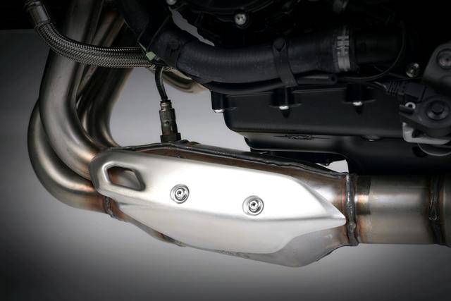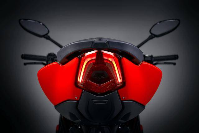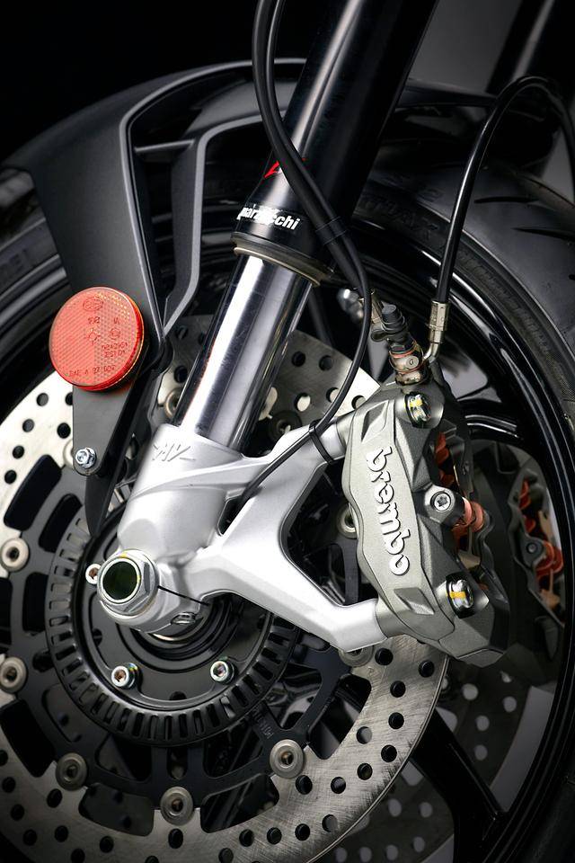 車體方面,沿用了現(xiàn)有的鋼管制車架、后單搖臂,叉芯口徑為 43 mm、行程為 125 mm 的 Marzocchi 倒立式前叉,行程為 130 mm 的 Sachs 后減震;制動(dòng)系統(tǒng),標(biāo)配了 Brembo 布雷博的剎車卡鉗和剎車碟,Nissin 日信的制動(dòng)手泵;水滴型外觀風(fēng)格的 LED 前大燈,5.5 英寸的 TFT 數(shù)字式儀表板等。