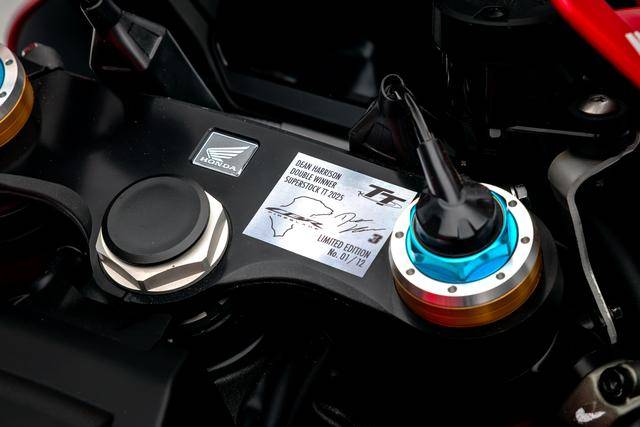 與原廠狀態(tài)的 2025 款 SP 版相比,哈里森復(fù)制限量版、采用了一個(gè)與哈里森在 2025 人島 TT 時(shí)所駕駛之賽車相同的車身圖案/貼花,上三星(前叉上三角臺(tái))帶有紀(jì)念版編號(hào)的銘牌,換裝了 Honda 原廠的高前風(fēng)擋、乘客后座外蓋、HRC 油箱蓋,來自 GB Racing 的發(fā)動(dòng)機(jī)側(cè)蓋,Evotech 的車把護(hù)架(護(hù)弓)、散熱水箱罩等。