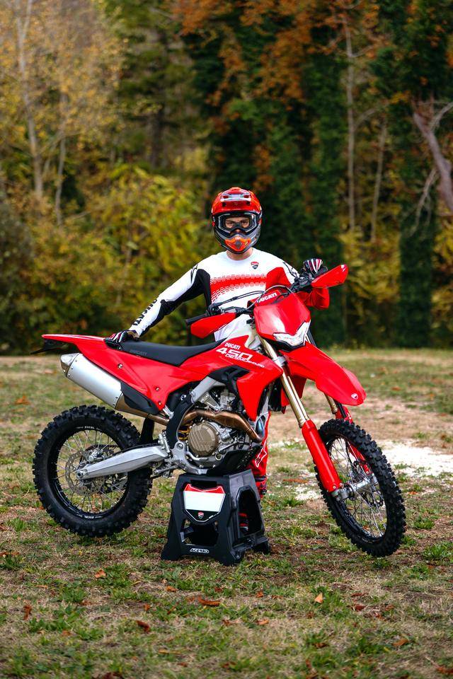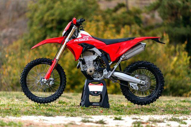 杜卡迪在今年四月正式發(fā)布了屬于 MX(Motocross,場(chǎng)地越野)規(guī)格的全新市售越野賽車 Desmo450 MX,這是杜卡迪歷史上的第一款市售越野賽車。市售規(guī)格的 Desmo450 MX 搭載一副水冷四沖程單氣缸、DOHC 四氣閥、Desmodromic 氣閥正時(shí)控制(軸控制氣閥,而常見的氣閥開合控制組件是彈簧)的發(fā)動(dòng)機(jī),缸徑、行程為 96 mm x 62.1 mm,排氣量 449.6 cc,峰值動(dòng)力輸出 46.7 kw(約 63.5 匹)/9400 rpm,最大扭矩輸出 53.5 N.m/7500 rpm。
