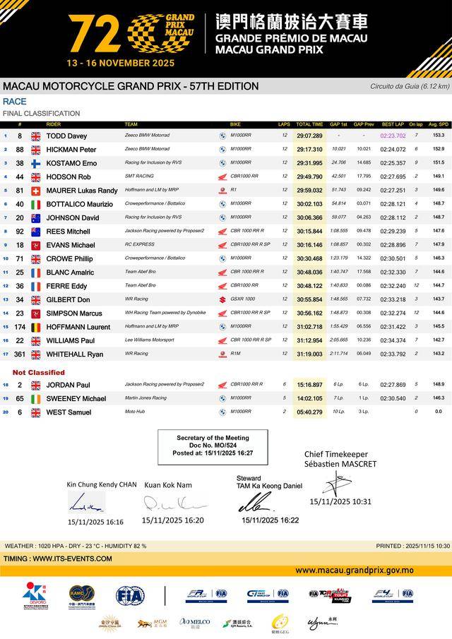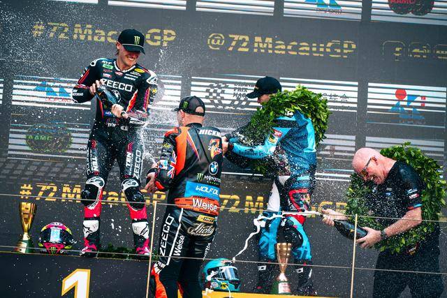 摩托車的主要競(jìng)賽環(huán)節(jié)在上周末(十一月 15 日)早上展開。在排位賽,駕駛 8 號(hào)車、來自英國(guó)的托德(Davey John Todd),這位去年的冠軍、以破紀(jì)錄的 2 分 23.413 秒圈速(舊紀(jì)錄是 2010 年時(shí)的 2 分 23.616 秒)拿到了排頭位發(fā)車;38 號(hào)車、2022 年的冠軍、來自芬蘭的哥達(dá)摩(Erno Kostamo)排在第二;88 號(hào)賽車、來自英國(guó)的澳門 GP 三屆冠軍赫爾文(Peter Hickman)排在第三,他與哥達(dá)摩的圈速都在 2 分 25 秒的級(jí)別。