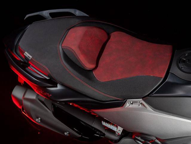 25周年紀(jì)念款不同于常規(guī)的年度改款,它并未對核心動(dòng)力和配置結(jié)構(gòu)進(jìn)行大幅調(diào)整,而是專注于外觀細(xì)節(jié)的精細(xì)化打磨。新車采用啞光深灰金屬漆為主色調(diào),車身線條硬朗流暢,在光影下呈現(xiàn)出低調(diào)而深邃的質(zhì)感。設(shè)計(jì)師通過紅色元素的巧妙點(diǎn)綴,為整車注入運(yùn)動(dòng)激情。坐墊處專屬紅色皮革包覆,搭配紅色縫線與靠背壓印的“TMAX”字樣,形成視覺焦點(diǎn)。龍骨處鑲嵌“BLACK MAX”金屬徽章,車身配備了專屬25周年3D紀(jì)念標(biāo),車側(cè)的TMAX銘牌也以紅色呈現(xiàn),一眼便能辨識出其獨(dú)一無二的身份。7英寸TFT全彩液晶儀表新增“25th Anniversary”開機(jī)動(dòng)畫,支持Garmin導(dǎo)航App連接,科技感與儀式感并存。