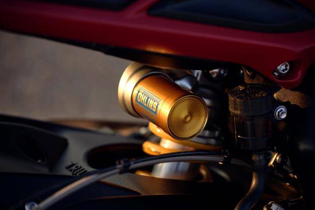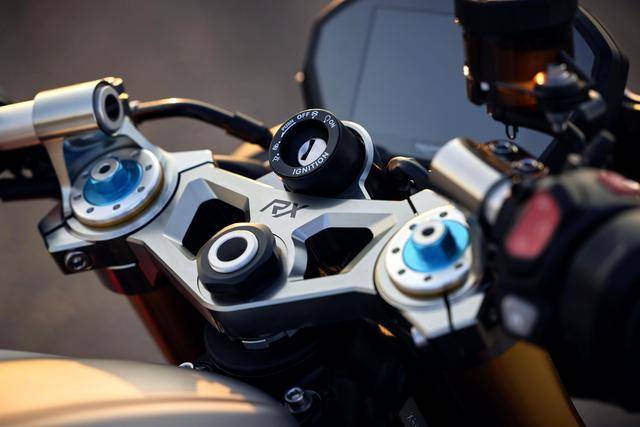 3、車體細(xì)節(jié)上,RX 版換上一個(gè) CNC 加工而成的上三星(上前叉三角臺(tái)),并刻有 RX 的字樣、以紀(jì)念他們?cè)?2015 年首次推出的 RX 版本車型;定制的鞍座、消聲器尾部也有 RX 的字樣;