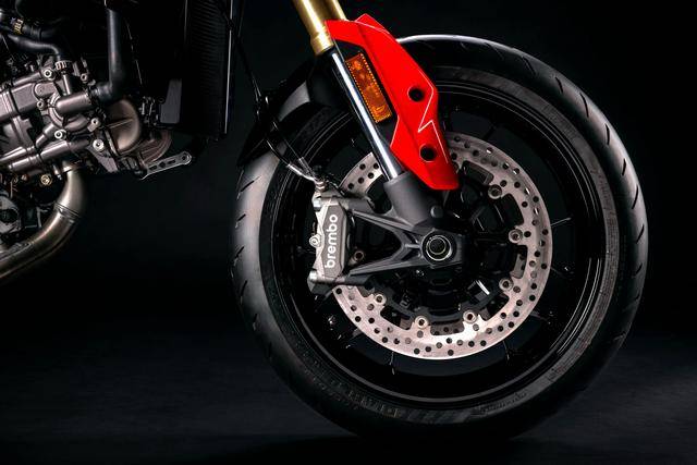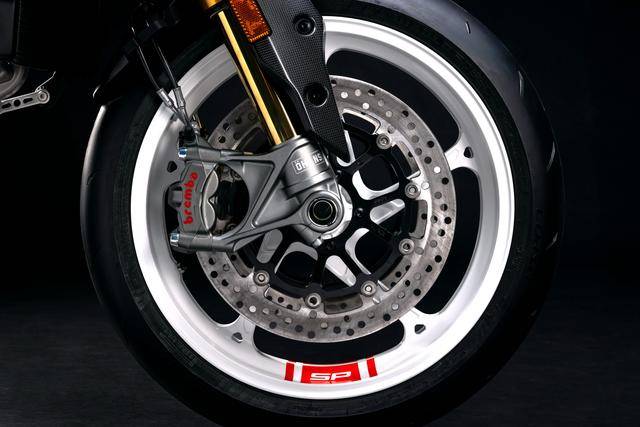 8、兩個(gè)版本均采用了 Brembo 布雷博配套的制動(dòng)系統(tǒng):標(biāo)準(zhǔn)款采用了 PR18/19 徑向主缸的 M4.32 整體式前剎車卡鉗,而 SP 版則采用了更高規(guī)格的、PR16/21 徑向主缸的 M50 前剎車卡鉗;