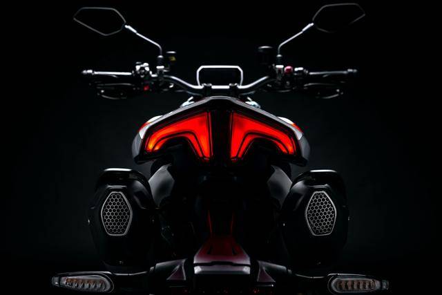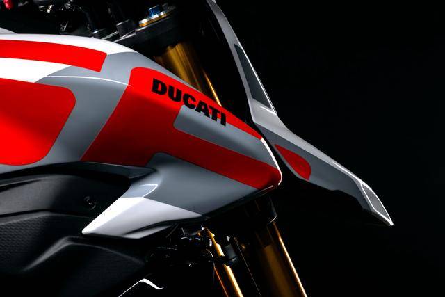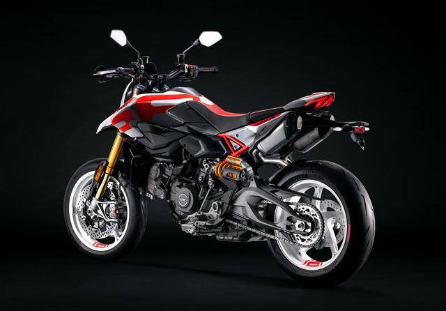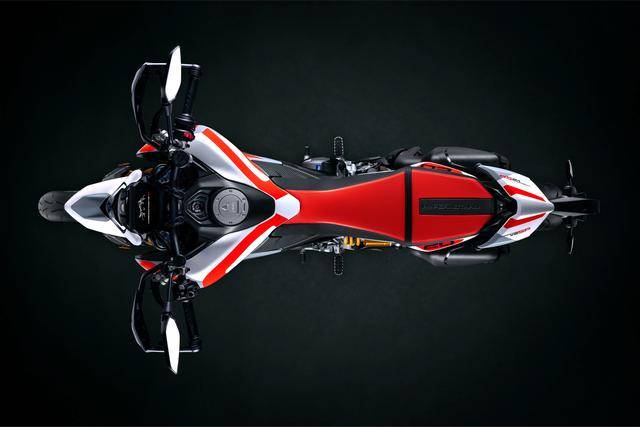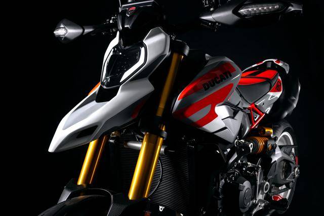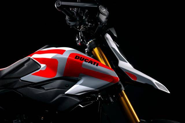 6、造型上,新一代 Hypermotard 的設(shè)計(jì)靈感來(lái)自初代的 Hypermotard 1100,采用了全新設(shè)計(jì)的、集成了日間行車燈的 LED 前大燈,浮動(dòng)式高位的 LED 后燈組,新的鞍座等;而 SP 版采用了一個(gè)專屬的圖案,車身上 20 的字樣,其用意是紀(jì)念該車型的二十周年;
