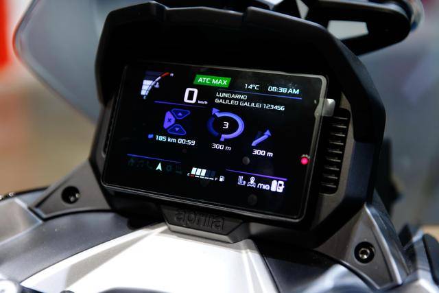 5、外觀造型上,采用了一個阿普利亞運(yùn)動車型 + 探險車的混合體風(fēng)格,前 LED 大燈的輪廓可讓人想到他們的 RSV,較高的前風(fēng)擋、車把兩端的護(hù)罩則是一個典型的探險車風(fēng)格;手動可調(diào)的前風(fēng)擋,在 70 mm 的調(diào)節(jié)范圍內(nèi)、提供五級選擇;