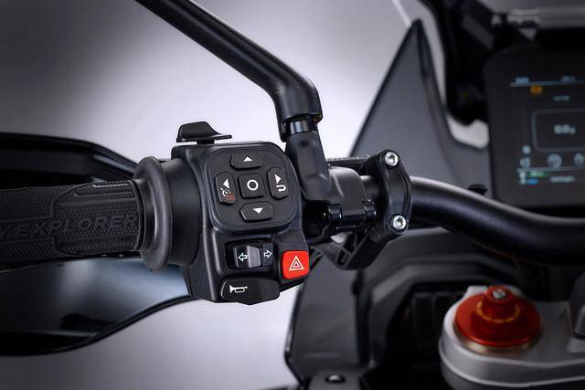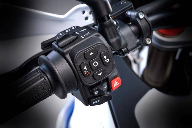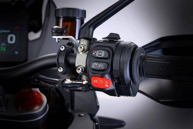 6、電子控制系統(tǒng)方面,采用了電控油門、集成了六軸的 IMU,標(biāo)配四個可選的騎行模式、八個級別可調(diào)的牽引力控制(五個專用于常規(guī)道路、兩個用于越野道路、一個用于雨天),兩級可調(diào)的發(fā)動機(jī)制動控制,彎道 ABS,巡航控制,快速換檔系統(tǒng)。