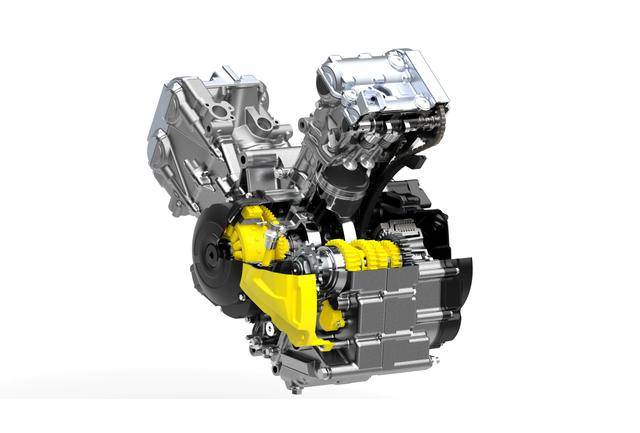 3、下圖 4 中的黃色部分,是在現(xiàn)有機器的基礎上、SV-7GX 動力單元經(jīng)過修改的部分,包括了磁電機和六檔變速齒輪箱內的傳動齒輪(有別于 SV650 的減速比),一系列的動力單元升級,其核心是適用新的電子裝備、并對應運動旅行車的使用場景;