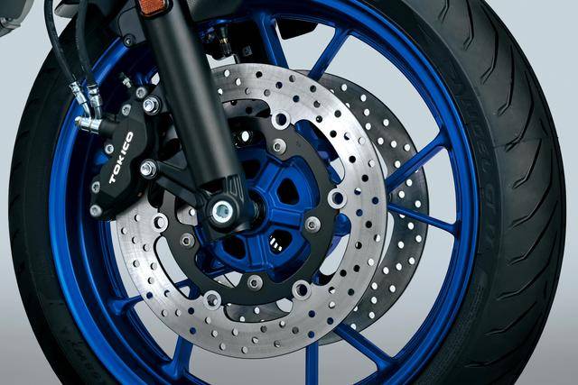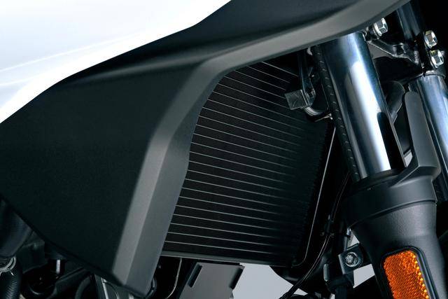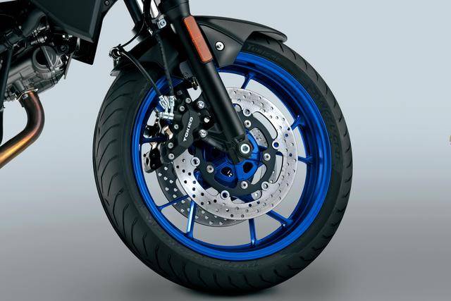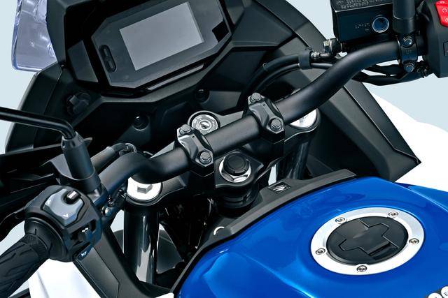 6、懸掛系統(tǒng)方面的特性、與 SV650 運動街車相近:前面是叉芯口徑為 41 mm、行程為 125 mm 的正立式前叉(DL650XT 的前叉標準行程為 150 mm),后面是行程為 129 mm 的后減震(DL650XT 后減震的標準行程為 160 mm)。為應對不同的使用場景,以及騎行位置和重量分布上的變化,GX 版的懸掛系統(tǒng)采用了一個較具寬容度的校準,并對前叉的上三星(前叉上三角臺)作了一些修改;
