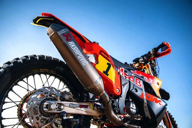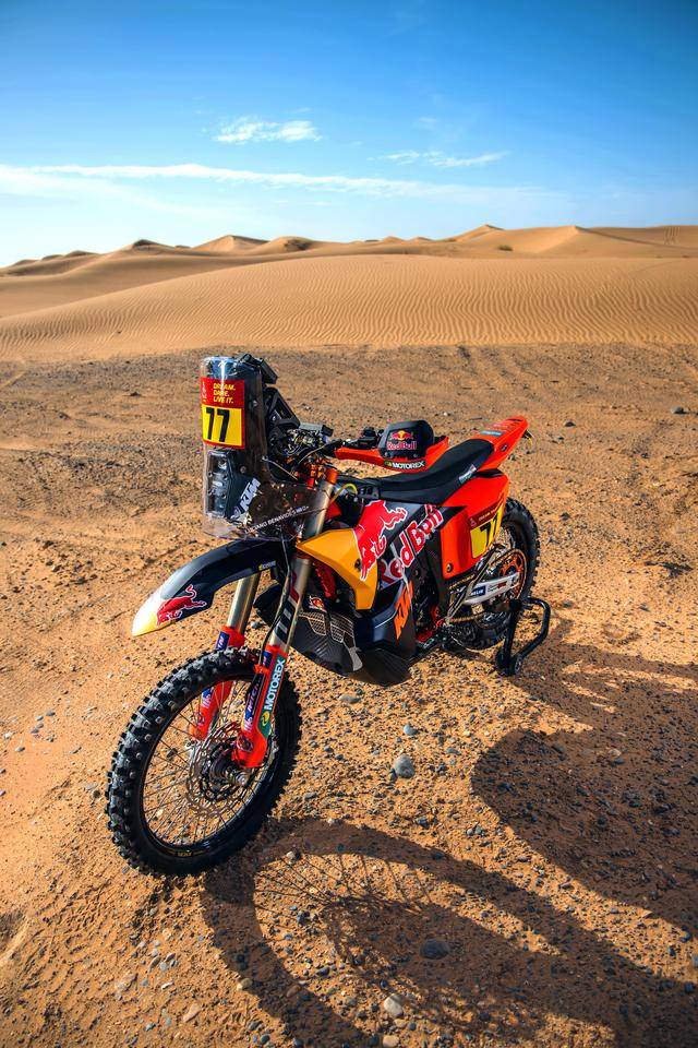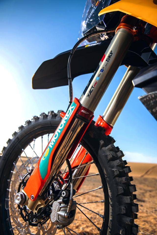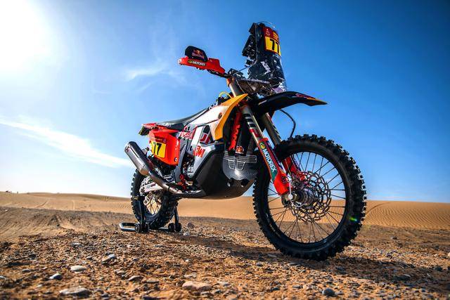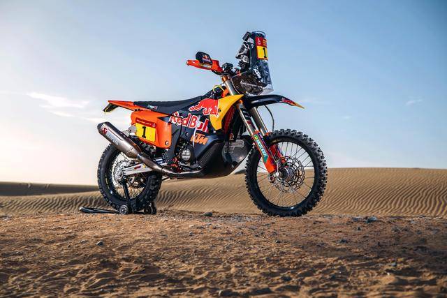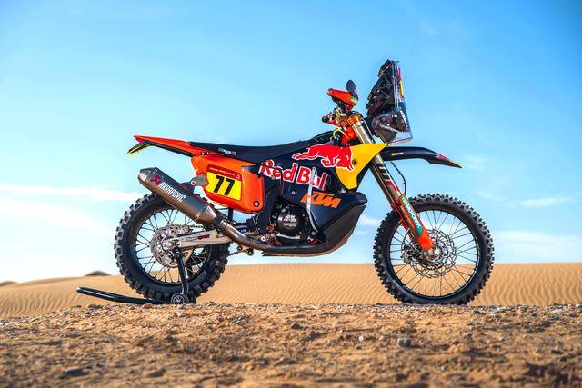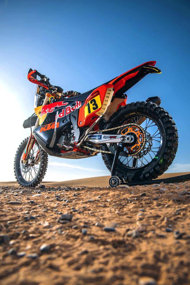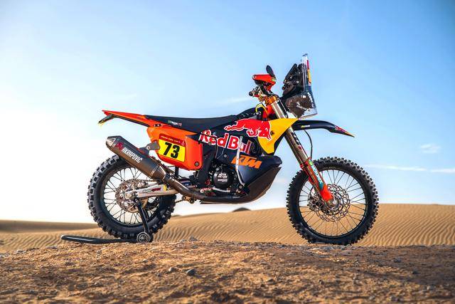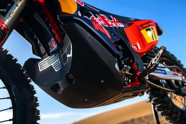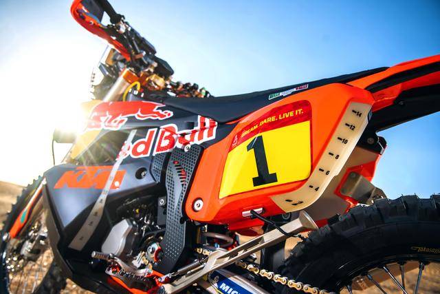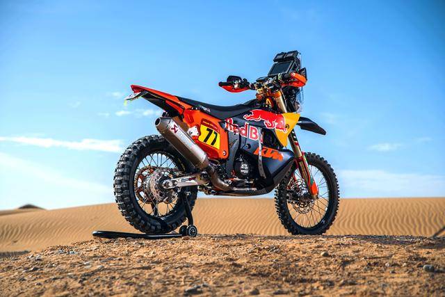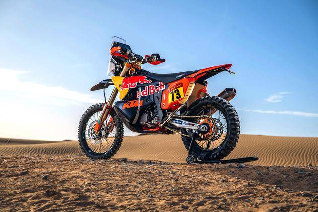 KTM 的拉力工廠賽車是 KTM 450 Rally,該車基于 MX 場地越野賽車 450 SX-F 經大幅修改而成,搭載一副水冷四沖程單氣缸的發(fā)動機,經過賽車部門特制的、針對拉力賽特性的氣缸蓋,鈦合金制的氣閥,經過強化的離合器、以及特制的六檔變速齒輪箱;車體方面,采用一副專為拉力賽設計的鋼制車架,WP 配套的賽車懸掛系統(tǒng);全車配備了三個可獨立供油的油箱,總的燃料攜帶量為 35 公升。