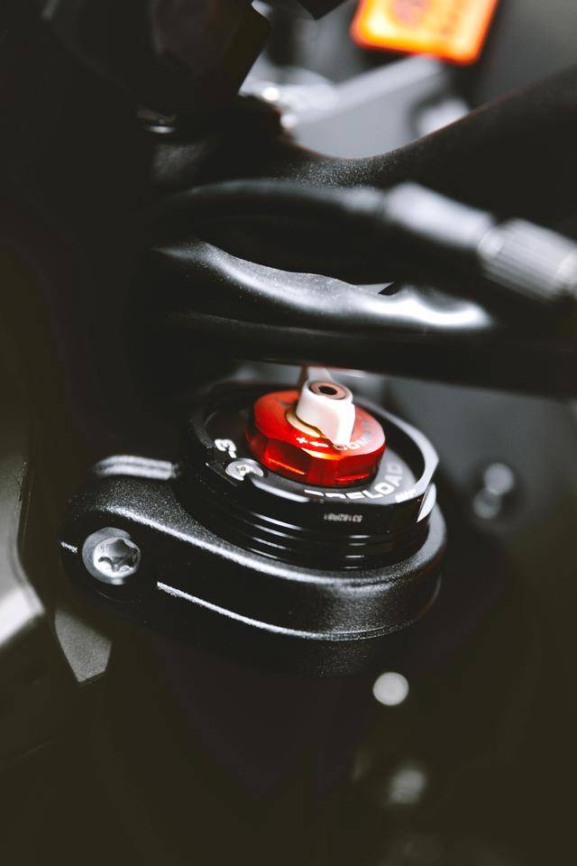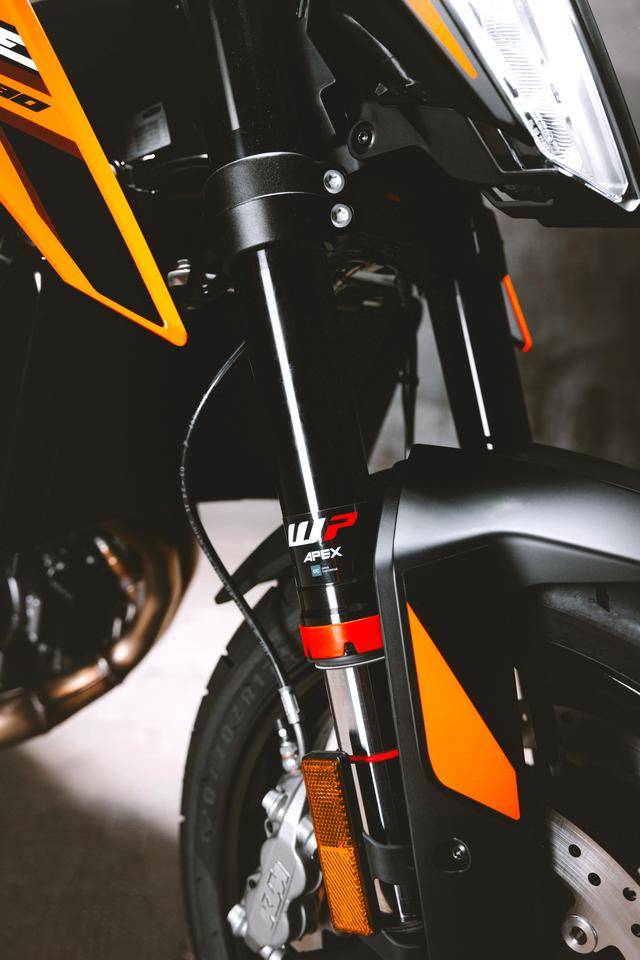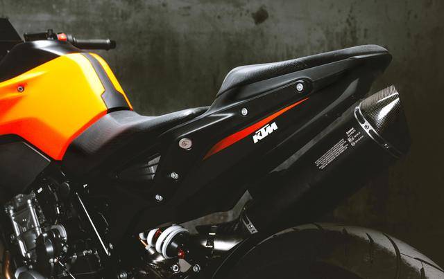 車(chē)體方面,采用一副鋼管式的車(chē)架,WP APEX 的前后懸掛系統(tǒng),前面是叉芯口徑為 43 mm、標(biāo)準(zhǔn)行程為 140 mm 的倒立式前叉,后面是標(biāo)準(zhǔn)行程為 150 mm 的單筒式后減震;車(chē)身采用一個(gè)鋒利的外觀造型,家族化臉譜的 LED 前大燈;電子輔助控制系統(tǒng)方面,配備了電子控制油門(mén)、可選的三個(gè)騎行模式(Rain 雨天、Street 街道、Sport 運(yùn)動(dòng))、牽引力控制、ABS,此外,用戶(hù)可額外選裝另外兩個(gè)騎行模式(Track 賽道模式、Performance 高性能模式)。
