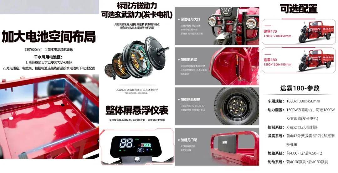 宗申途霸180作為途霸系列的主推型號,專為鄉(xiāng)鎮(zhèn)山野的復(fù)雜路況打造,在山區(qū)運(yùn)輸、陡坡作業(yè)場景中表現(xiàn)亮眼。主要得益于其電機(jī)動(dòng)力達(dá)1500W(最高可選1800W發(fā)卡電機(jī)),再搭配上品牌專屬玄武動(dòng)力系統(tǒng),使車輛理論性能提升75%,即使是滿載爬坡依舊輕松。