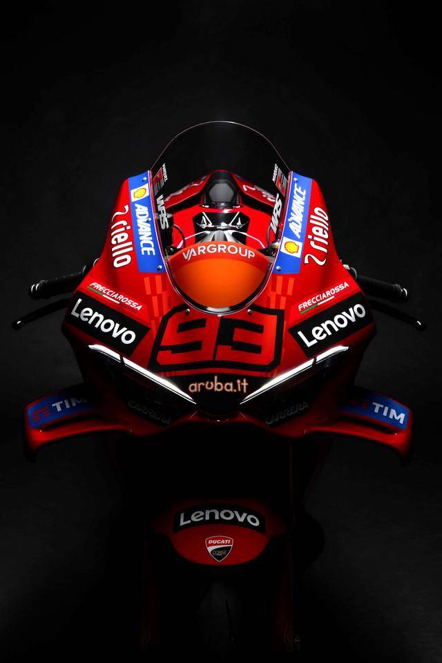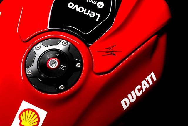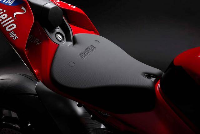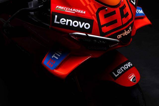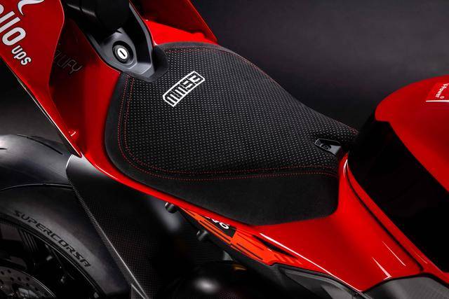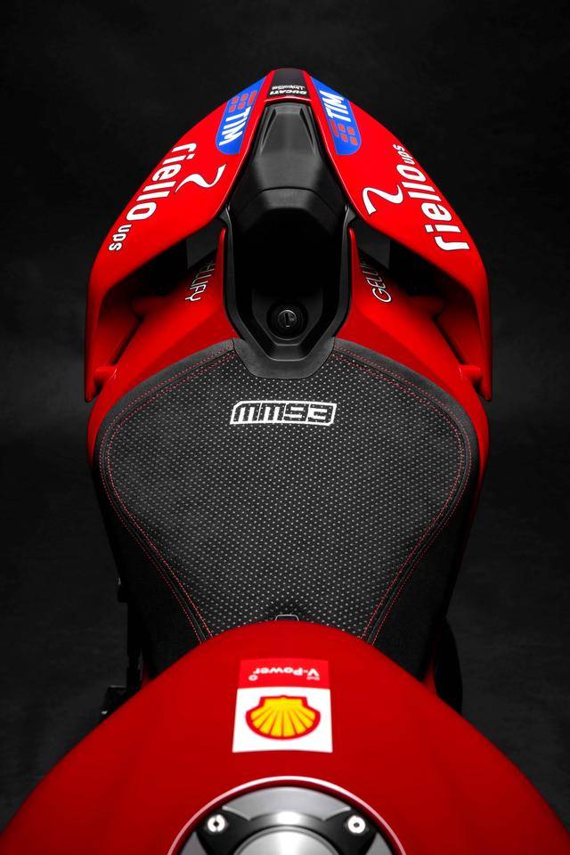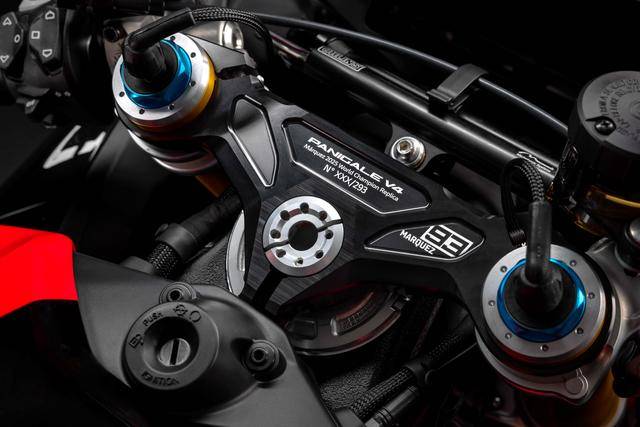4、車身換上了 2025 杜卡迪 MotoGP 工廠賽車相近的貼花/圖案,油箱上有馬昆斯的簽名字樣,上三星(上前叉三角臺(tái))有限量版的編號(hào)和 93 Marquez 的字樣,定制的鞍座也帶有 MM93 的字樣,帶序列號(hào)的專用鋁制鑰匙;