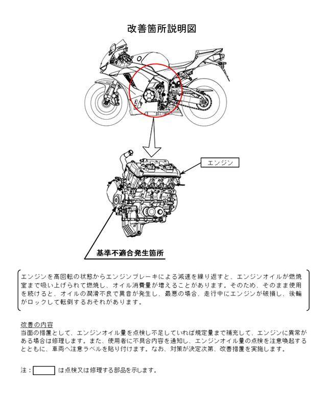 本次召回的原因,是上述的幾個車型,如果在高轉(zhuǎn)速狀態(tài)下、頻繁地進行發(fā)動機制動操作的減速,則有可能導(dǎo)致發(fā)動機的潤滑油被吸入到燃燒室而產(chǎn)生燃燒,讓潤滑油的消耗量增加(注:類似于我們平時口中的 “ 吃機油 ”、“ 燒機油 ”)。在這樣的情況下繼續(xù)使用的話,機器會因為潤滑不良而產(chǎn)生噪音;在極端的情況下,發(fā)動機有可能在行駛過程中損壞,從而導(dǎo)致后輪被鎖死而摔倒。