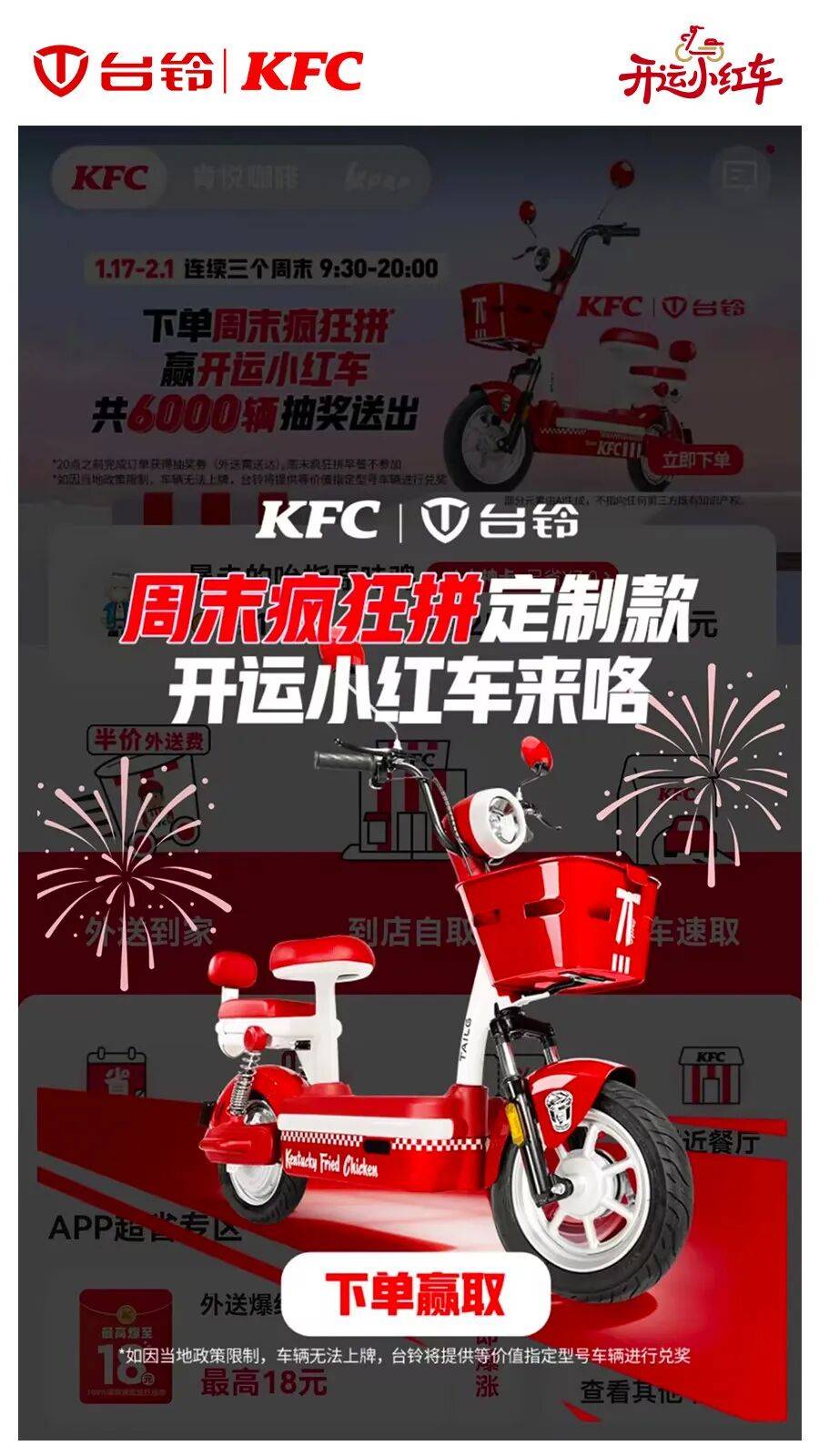 核心提示:1月18日這個周末,一抹開運紅正席卷街頭!臺鈴肯德基聯(lián)名活動高能開場,開運小紅車驚艷出街,全國路演同步開玩,一起騎遇新年好