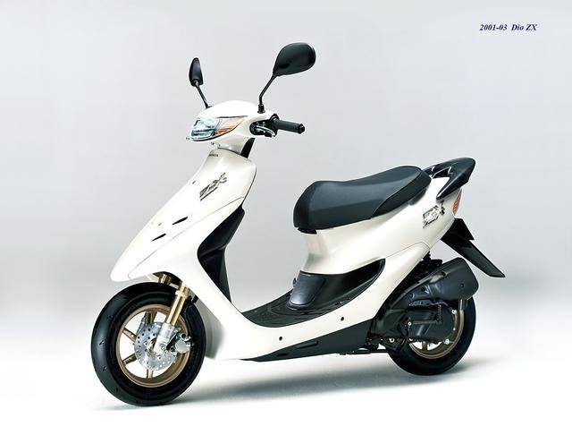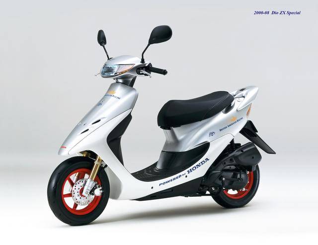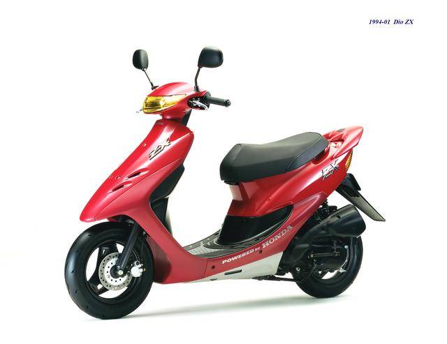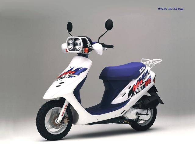 3、第二代 Dio 在 1990 年十二月首次公開,工廠編號為 AF27、發(fā)動機(jī)編號仍為第一代的 AF18E,更新周期從 1990 到 1993 年十一月,期間先后推出過多個不同的衍生版本:1991 年一月推出了采用前碟剎的 Dio SR(AF28),1992 年二月首次推出了前碟剎、帶車尾定風(fēng)翼的 ZX 版(AF28),1994 年首次公開的、具有鮮明外部特征的 Dio Baja(AF28),此外,在 1997 年五月還推出了衍生車型 Dio Fit“ 瘦身 ” 版(AF27),690 mm 的鞍座高度(標(biāo)準(zhǔn)款為 700 mm)、67 公斤的整備重量(標(biāo)準(zhǔn)款為 73 公斤),是該版本的特點(diǎn);
