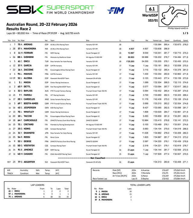 周日進(jìn)行的 WorldSSP 第二節(jié)正賽、在濕地之下拉開帷幕,幾個(gè)發(fā)車前就裝上了干地輪胎、賭天氣會(huì)好轉(zhuǎn)的車手,免去了進(jìn)站更換輪胎的時(shí)間損耗,成為了這場 18 圈之較量中的贏家。一開始就以干地輪胎登場、駕駛 75 號車的西班牙車手阿里納斯(Albert Arenas),最終率先沖線拿到了勝利。這位 2020 年的 Moto3 世界冠軍、去年仍在 Moto2 級別,2026 賽季首次來到 WorldSSP、就在這場揭幕戰(zhàn)拿到了他在該級別的首個(gè)冠軍。