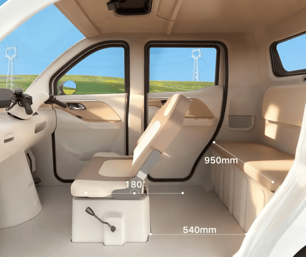 同事,車輛座艙內(nèi)配備前排汽車級舒適座椅,靠背可180°調(diào)節(jié),單人駕駛時可放平休息,實用性拉滿。中控區(qū)搭載18寸TFT組合屏,可實現(xiàn)接聽電話、影音娛樂等功能,科技感十足;一鍵啟動、一鍵倒車、高效暖風(fēng)機、四門電動、四門中控等配置一應(yīng)俱全,完全對標(biāo)汽車級便捷體驗。