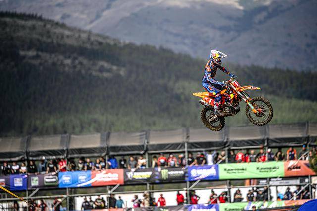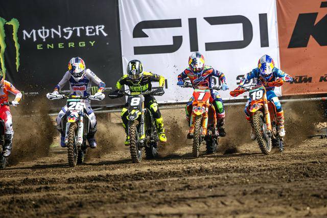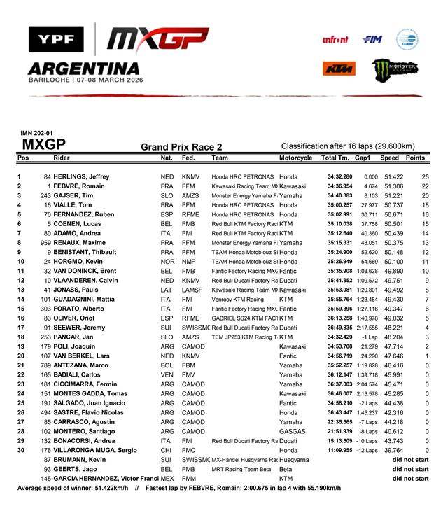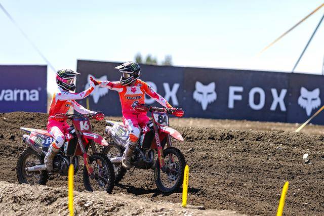 第一節(jié)比賽,賀靈斯的隊(duì)友、駕駛 16 號(hào)車的法國(guó)車手維亞里(Tom Vialle)奪得了亞軍,他也是同樣今年才轉(zhuǎn)到 HRC 陣營(yíng);應(yīng)屆世界冠軍、駕駛 1 號(hào)車的費(fèi)布爾(Romain Febvre)拿到了季軍。第二節(jié)比賽,尾隨在賀靈斯后面,費(fèi)布爾落后 4 秒多拿到了亞軍,駕駛 243 號(hào)車的斯洛文尼亞車手蓋沙(Tim Gajser)奪得了季軍。
