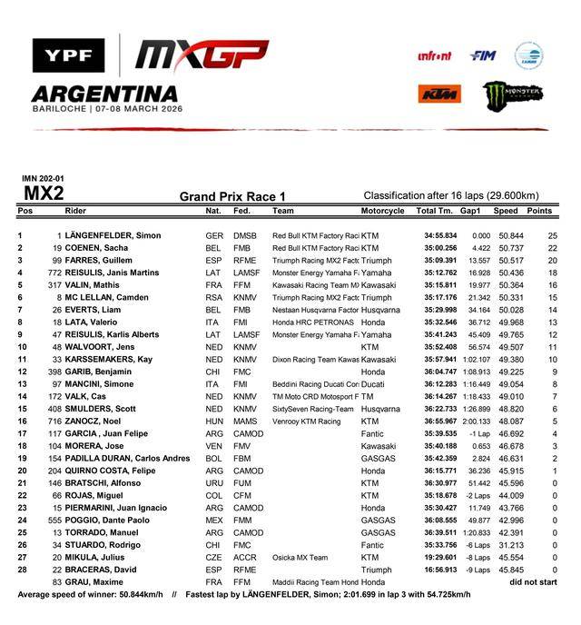 MX2 級(jí)別,應(yīng)屆世界冠軍、駕駛 1 號(hào)車的德國(guó)車手朗根菲爾德(Simon Langenfelder)在兩節(jié)的正賽里都順利奪冠,拿到了新賽季首站比賽的全勝。