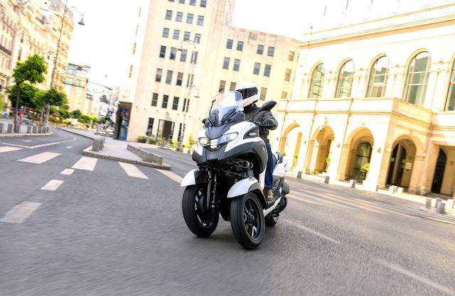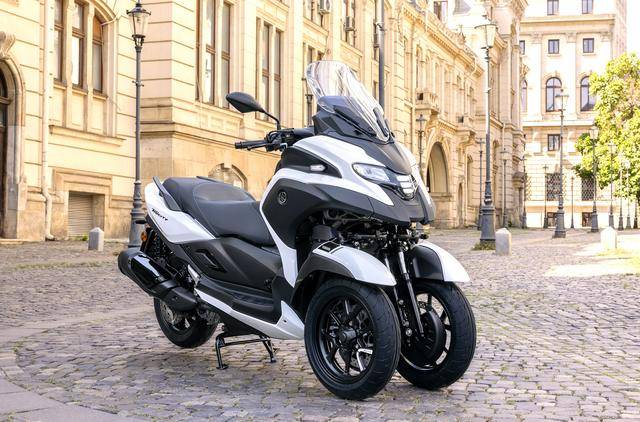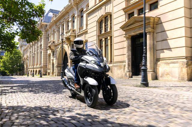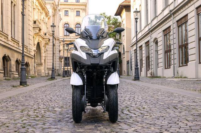 車體方面,采用一副鋼制主樑、帶加強(qiáng)肋的車架,標(biāo)志性的可傾側(cè)前輪系統(tǒng),其懸掛 + 轉(zhuǎn)向控制系統(tǒng)采用平行四邊形的連桿和搖臂式的前懸掛,每側(cè)雙正立式的前叉管、被配置在前輪的內(nèi)側(cè)。廠方稱,這一布局之下,無論是在光滑或者崎嶇表面的道路上行駛時(shí),雙輪所特有的、更多的抓地力,都能為車輛提供穩(wěn)定、靈活和自信的操控。