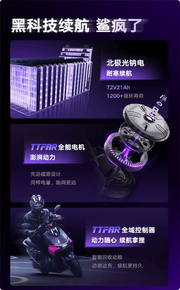 動力部分,新車搭載1200W TTFAR全能電機,峰值功率可達3100W,常規(guī)模式最高時速55km/h,開啟狂暴模式可沖刺至58km/h,爬坡與超車更從容。