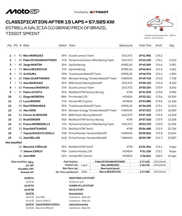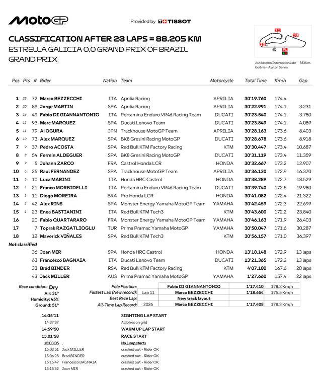 FIM GP 世界錦標(biāo)賽(FIM Grand Prix World Championship,也被稱之為 MotoGP)2026 賽季第二站的角逐,三月 20 - 22 日移師南美洲的巴西舉行,這是自 2004 年最后一次辦賽、時(shí)隔二十二年之后重新回到巴西。