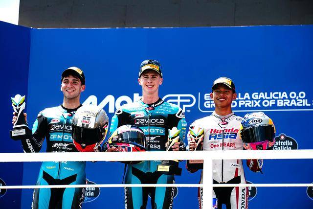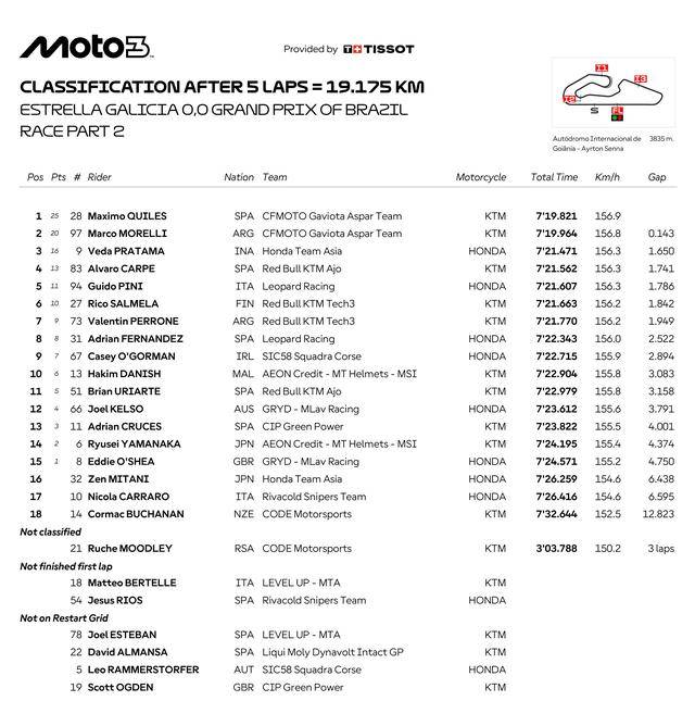 Moto3 級(jí)別,首次的發(fā)車、到第 15 圈時(shí)因?yàn)橐馔舛患t旗終止。重新發(fā)車、比賽縮減到只剩 5 圈。彼此都拼盡全力的角逐之后,駕駛 28 號(hào)車的西班牙車手奎爾斯(Maximo Quiles)與隊(duì)友、97 號(hào)車的阿根廷車手莫雷利(Marco Morelli)幾乎同時(shí)沖線,奎爾斯奪得了冠軍、連續(xù)兩站比賽都登上頒獎(jiǎng)臺(tái),莫雷利獲得亞軍。季軍之爭非常激烈,駕駛 9 號(hào)車的印尼車手普拉塔馬(Veda Pratama)最終拿到了季軍,歷史性地拿到了個(gè)人在 GP 職業(yè)生涯的首次頒獎(jiǎng)臺(tái)。