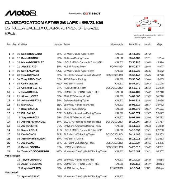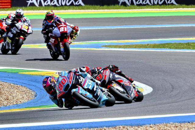 Moto2 級(jí)別的賽程為 26 圈,經(jīng)歷了上半段比賽的糾纏之后,駕駛 96 號(hào)車的西班牙車手霍加多(Daniel Holgado),64 號(hào)車的西班牙車手穆諾茲(David Munoz),成為了后半段比賽里、冠軍的主要爭奪者。盡管在比賽的后段、一度追了回來并取得領(lǐng)先,但今年首次升級(jí)到 Moto2 的穆諾茲最終沒能守住帶頭位置,霍加多最后奪得了冠軍,穆諾茲獲得了亞軍、首次登上 Moto2 級(jí)別的頒獎(jiǎng)臺(tái);18 號(hào)車的西班牙車手岡薩雷斯(Manuel Gonzalez)拿到了季軍,連續(xù)兩站都登上了頒獎(jiǎng)臺(tái)。