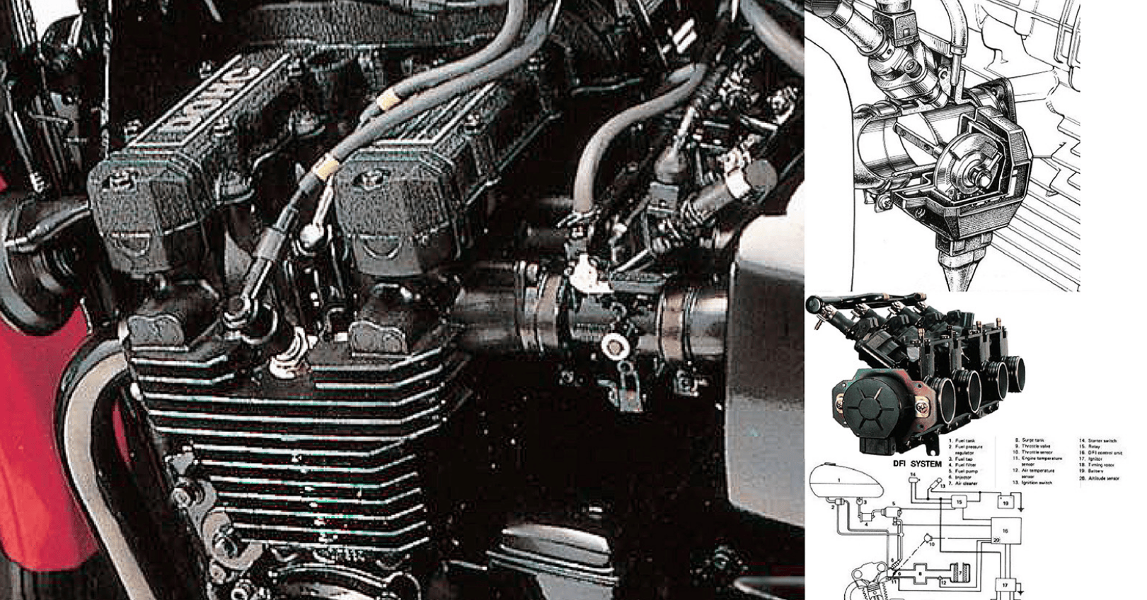于是,他們找上了德國(guó)博世合作,開啟了燃料噴射計(jì)劃,最初的試水之作是1980年的Z1000H,但真正成熟的系統(tǒng)則出現(xiàn)在隔年的Z1100GP上,這套被稱為D.F.I.(Digital Fuel Injection)的系統(tǒng),舍棄了早期利用空氣流量計(jì)偵測(cè)的笨重方式,改以更精準(zhǔn)的數(shù)字感應(yīng)器來監(jiān)控節(jié)氣門位置與引擎轉(zhuǎn)速, 這在當(dāng)時(shí)可是如同外星科技般的配備。