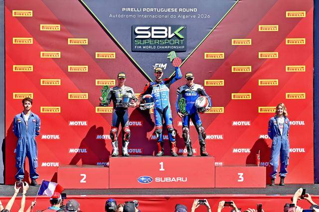 下面的圖片,2026 WorldSBK 葡萄牙站,奪得 WorldSSP 級(jí)別兩節(jié)正賽冠軍的 820RR 賽車和法國車手德比斯(資料圖片)。