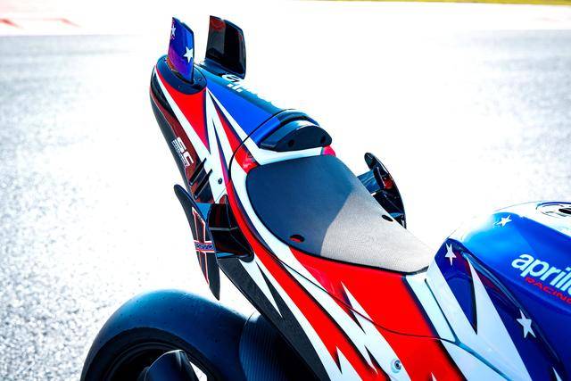 2、配備了從 MotoGP 工廠賽車衍生而來的空氣動力學(xué)組件,其中包括了鞍座兩側(cè)的定風(fēng)翼、尾翼,這是去年才首次應(yīng)用到 RS-GP25 上的裝備,該套件組合在轉(zhuǎn)向剎車時(shí)、可增加空氣動力的載荷,也增強(qiáng)了其他空氣動力學(xué)組件的下壓力;
