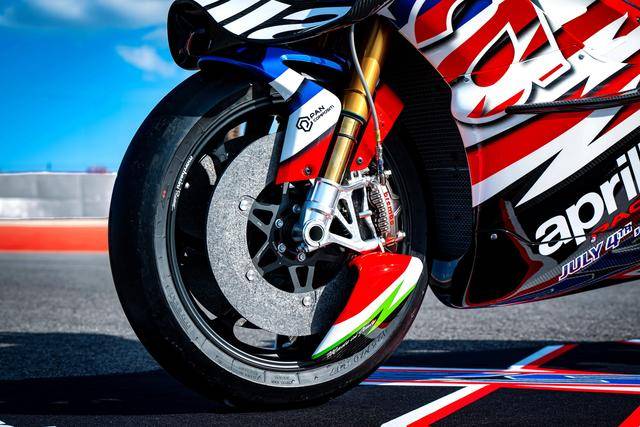 4、前制動系統(tǒng)采用了 Brembo 布雷博配套的剎車卡鉗和 340 mm 雙碳纖維剎車碟,并采用了更輕的碳纖維剎車片,廠方稱,該配置能讓 2026 Aprilia X 250th 的騎行體驗(yàn)和制動力、進(jìn)一步接近 MotoGP 原型車;