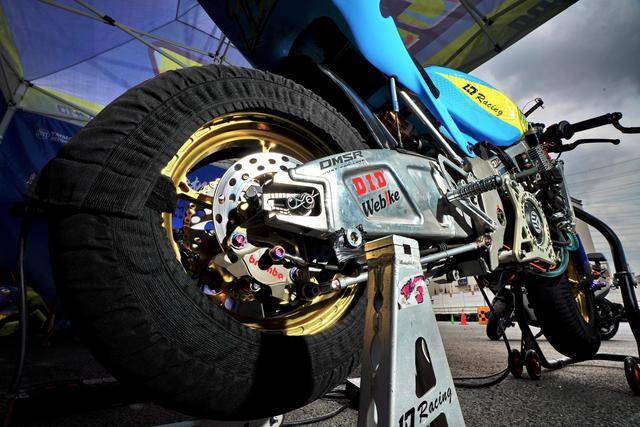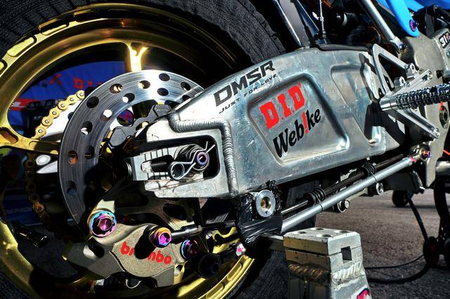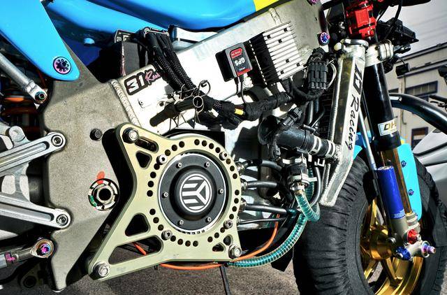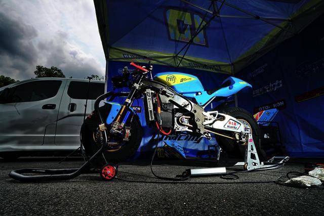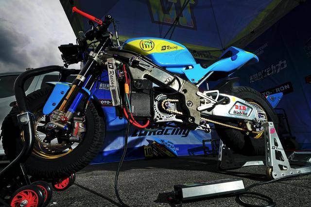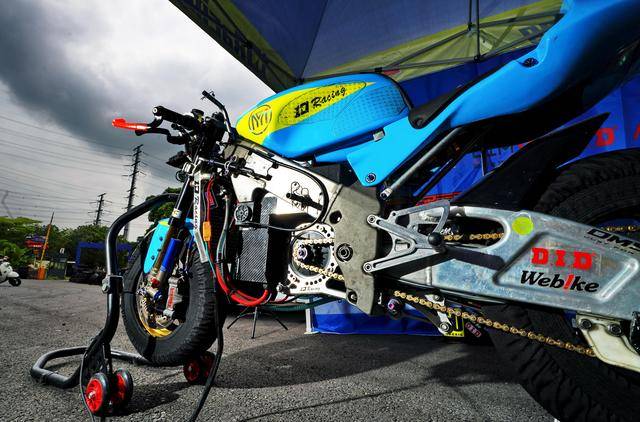 1、車體基于 1996 RS125 市售 GP125 賽車的車架/底盤打造,為對(duì)應(yīng)國(guó)內(nèi)電動(dòng)車組別的賽事規(guī)則,原車架所采用的 17 英寸車輪、被修為改 12 英寸。從最初的設(shè)計(jì)、特制組件的開(kāi)發(fā)、CNC 加工到最后裝配、測(cè)試等,均由李俊自己操刀,這車稱得上是他的 “ 半個(gè)孩子 ”;