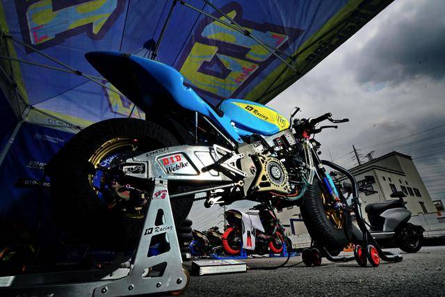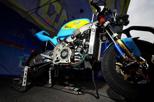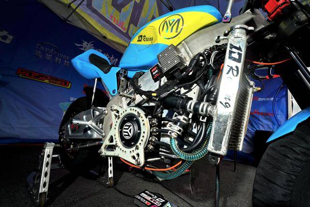 前不久的比賽里,我們?cè)俅卧谑|蕓的一堆踏板式電動(dòng)賽車?yán)?、看到了這輛倍受矚目的胯騎式電動(dòng)賽車 —— 尤其是它那副充滿了金屬機(jī)械感的、粗壯的 GP125 車架、后搖臂。
