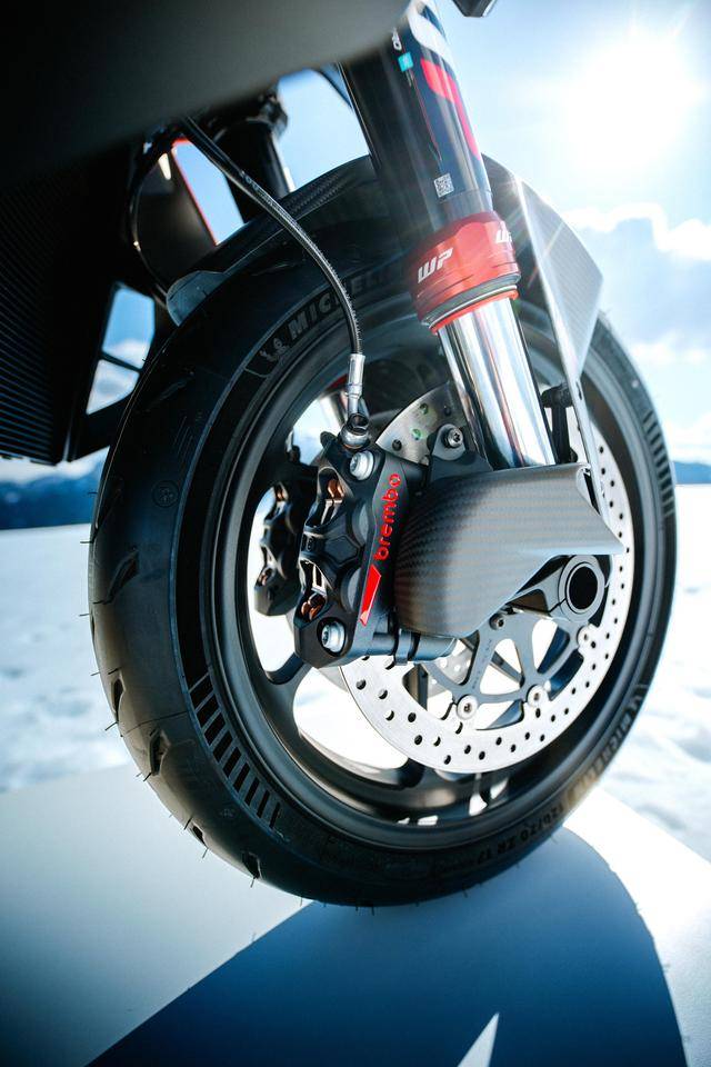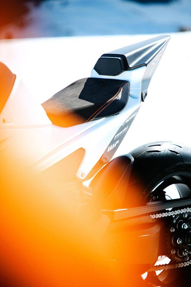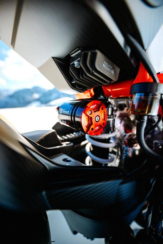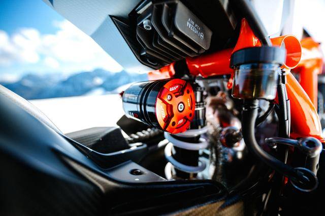 3、標(biāo)志性的變化之一,是換裝了由 MotoGP 技術(shù)衍生而來的 WP Pro Components 前后懸掛系統(tǒng)(R 版采用 WP APEX 懸掛系統(tǒng),R EVO 版采用 WP 第三代半主動式前后懸掛系統(tǒng)),倒立式前叉采用了整體式的設(shè)計(jì),具有更好的剛度和路面反饋;WP 8750 后減震是專為這款 RR 而設(shè)計(jì)的,不論是賽道還是公路上激烈的騎行,都可提供卓越的牽引力、穩(wěn)定性和可調(diào)性;