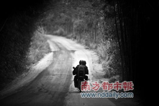 但單行道路不好走,花了1小時(shí)24分鐘,金雞鎮(zhèn)才進(jìn)入視野。“還有3公里左右的山路”,劉延全說(shuō)。劉海生見(jiàn)到熟悉街鎮(zhèn),興奮起來(lái),“我記得家就在附近”。但這段山路的異常難走,沿著山腳蜿蜒前行的小路寬約1.8米,坑洼連連,坐在車后面的劉海生與馮容清幾次差點(diǎn)跌下摩托車。北流河上有挖沙機(jī)開(kāi)始作業(yè),天色昏暗。