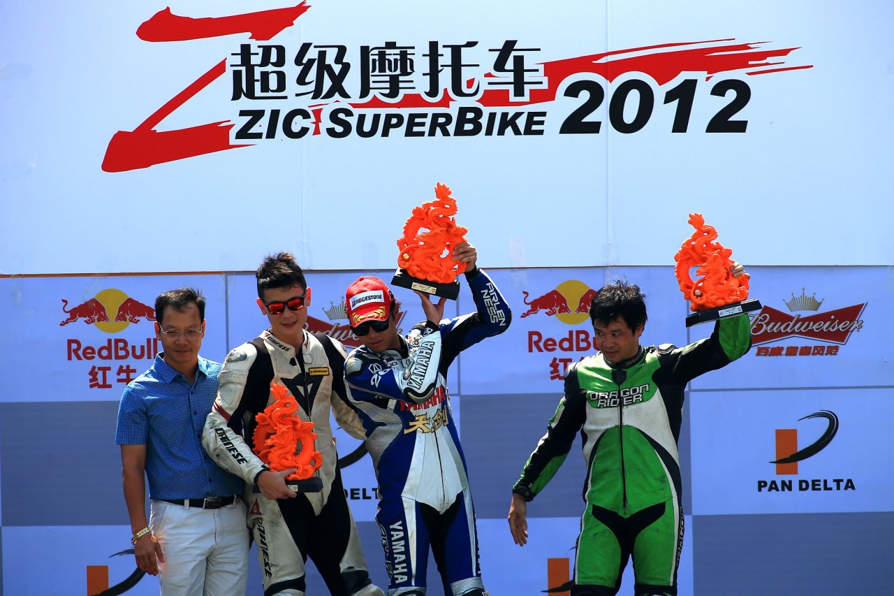 1:30分,超級摩托組的比賽正式開始。根據(jù)昨天的第二次排位成績,排在頭排發(fā)車的依然是Dan Kruger,中間是黃世釗,最右邊是第三李鄭鵬。和汽車比賽不同,摩托車組的比賽因為車小,每排有三臺賽車發(fā)車,這樣的發(fā)車位給了超摩車手更多的對抗機會。在上午的比賽中,Dan Kruger一騎絕塵,但中國摩托第一人黃世釗未嘗沒有機會。李鄭鵬相對于其他車手,已經有很不錯的表現(xiàn)。