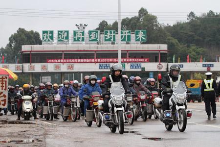 核心提示:交警警車開(kāi)道檢修摩托新春在即,兩廣交界的公路上又迎來(lái)了一年一度的摩托返鄉(xiāng)大軍,而過(guò)去由于摩托春運(yùn)大軍的人員結(jié)構(gòu)復(fù)雜,數(shù)量