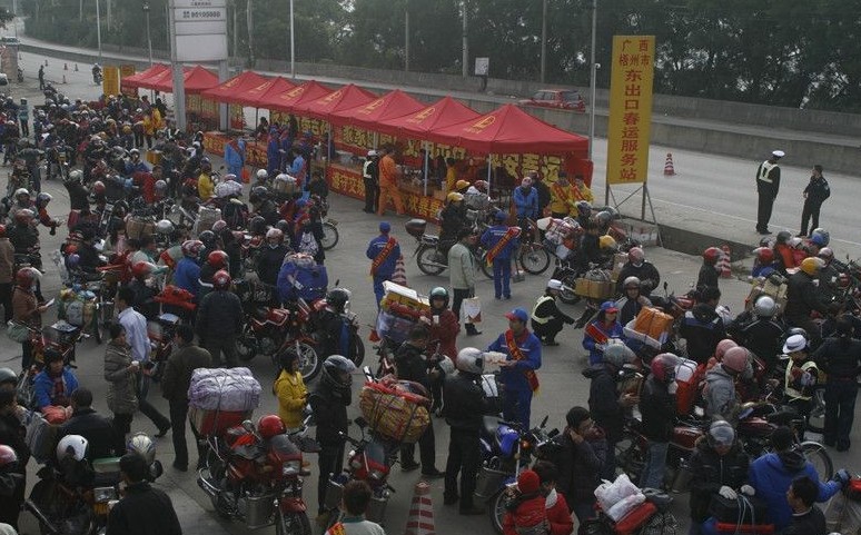 2008年以來,一支返鄉(xiāng)摩托車大軍悄然形成并迅速壯大。位于國(guó)道321兩廣交界處的梧州市東出口,是廣東務(wù)工人員返鄉(xiāng)的重要通道,每年春運(yùn)期間過境梧州的摩托車逐年快速增加。2012年春運(yùn)梧州東出口過境摩托車超過40萬輛,預(yù)計(jì)2013年過境摩托車將超過50萬輛次。