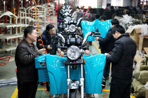 3月11日,該公司員工正在生產(chǎn)線上組裝三輪摩托車。