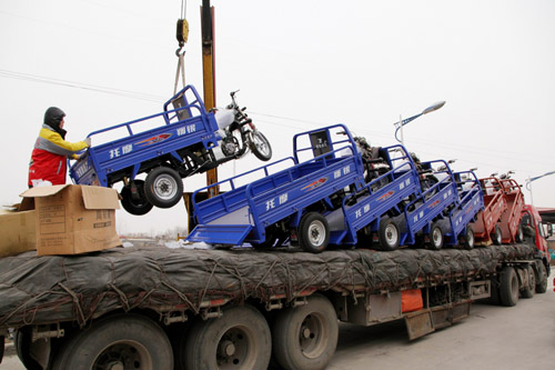 工人們正將三輪摩托車訂單產(chǎn)品裝車外運銷售。
