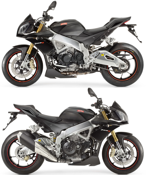 Aprilia Tuono V4R自從上市以來,可說是街車市場(chǎng)少數(shù)維持純正跑車設(shè)定的車款,與同血統(tǒng)的Aprilia RSV4跑車差異之處除了整流罩的大幅修減之外,以2011年式車型兩車型相比為例,Aprilia相當(dāng)自豪的再將Tuono V4R的輪圈輕量達(dá)2kg,讓車重減為179kg;并且峰值扭力11.1kgm(RSV4為11.7kgm)的并發(fā)也向下調(diào)整至9000rpm時(shí)展現(xiàn),而相同999c.c. V4引擎,在最大馬力輸出也從RSV4的180hp調(diào)整為162hp∕10000rpm,若是再加上全新APRC系統(tǒng),就如同國(guó)際媒體一致的評(píng)論,2011年式Aprilia Tuono V4R可說是一款裸著車身的仿賽車。