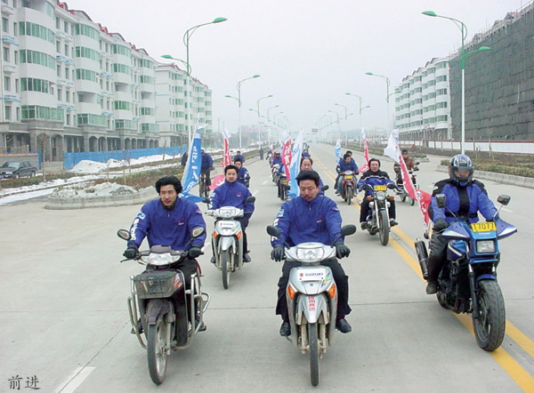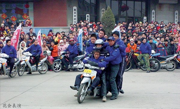 他們參加的最精彩也是最悲壯的一個(gè)活動(dòng)就是今年春節(jié)期間的花會(huì)表演。每年正月16,當(dāng)?shù)囟加恤[花會(huì)的習(xí)俗,屆時(shí)龍燈、獅子、旱船……很多民間傳統(tǒng)的項(xiàng)目都會(huì)亮相,煞是熱鬧。鹿泉摩托車俱樂(lè)部決定向大家展示充滿了現(xiàn)代激情的摩托表演,于是,2005年春節(jié),家家還陶醉在過(guò)年的氣氛中時(shí),他們就開(kāi)始悄悄練習(xí)上花會(huì)的節(jié)目了。