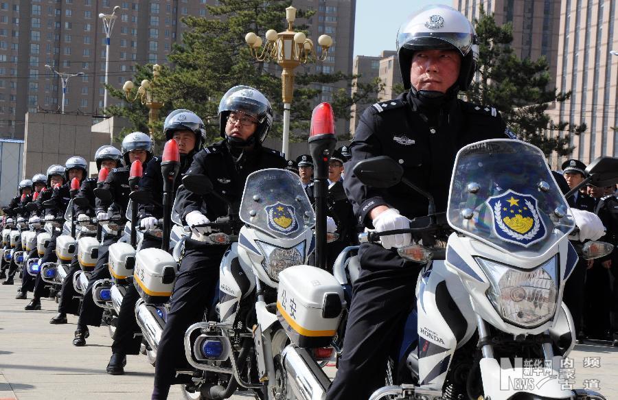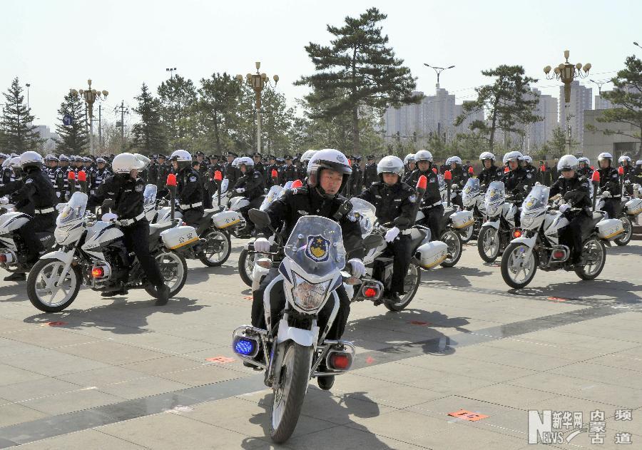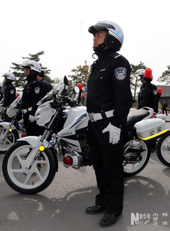 4月26日,呼和浩特市公安局民警在交通巡邏機(jī)制啟動(dòng)儀式上駕乘新配發(fā)的巡邏摩托車。