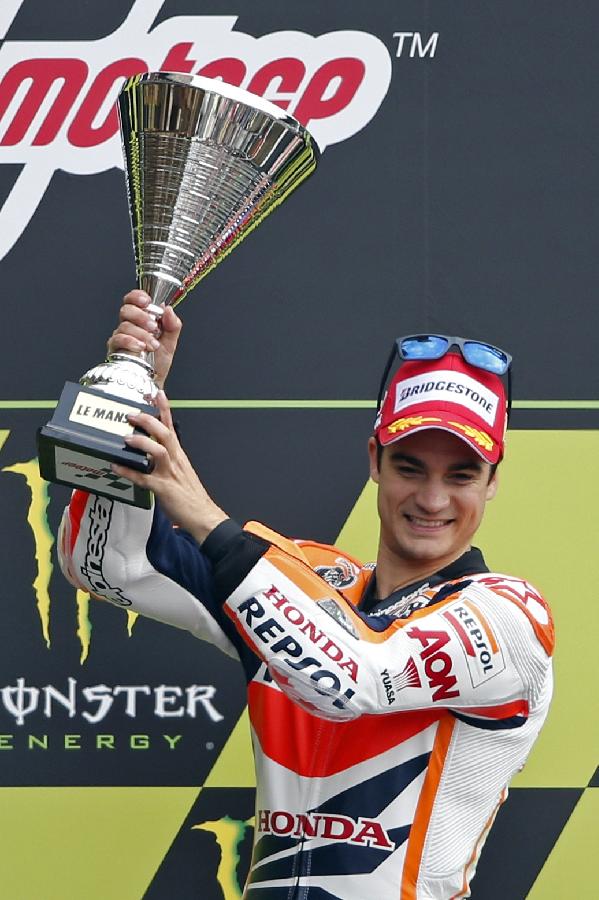 2013年5月19日 法國(guó)大獎(jiǎng)賽:西班牙車手佩德羅薩獲MOTOGP冠軍 5月19日,本田車隊(duì)西班牙車手佩德羅薩在頒獎(jiǎng)儀式上。當(dāng)日,在法國(guó)勒芒賽道進(jìn)行的法國(guó)